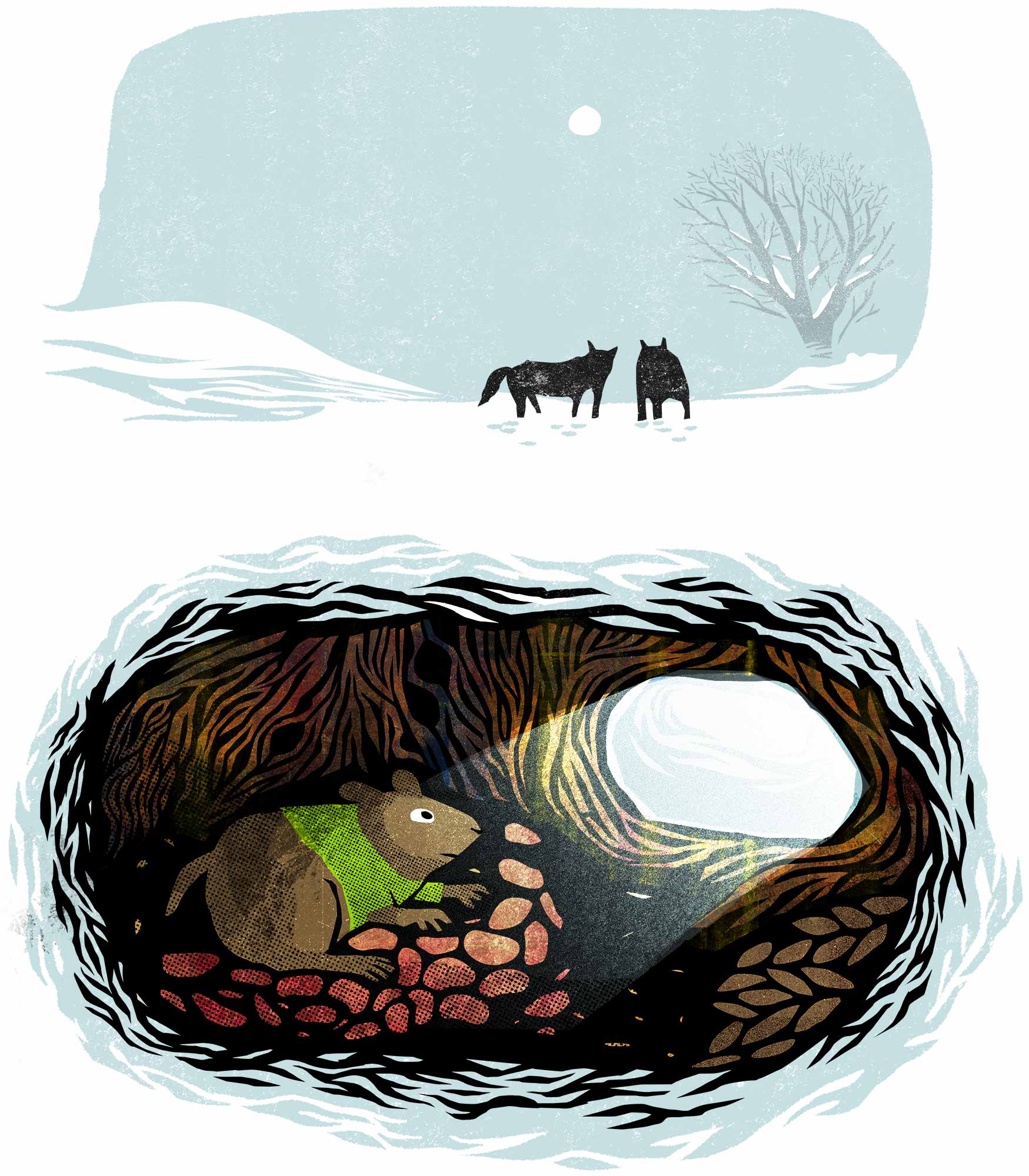 Then she began to plunge into the snow this way and that way, and sure enough, pretty soon she landed so close to Dani Meadow Mouse that one of her claws scratched her.